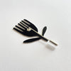 Wrack is a collection of handcrafted jewellery exploring the forms of objects and plants from our shoreline. Crafted in matt black anodised aluminium , this pin brooch has a silver plated stick pin and protector and is presented in a beautiful Tom Pigeon white sliding box. Created collaboratively between a metal workshop in the West of Scotland and Kirsty's riverside studio in Liverpool.