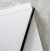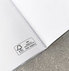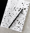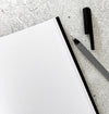 Soft-back notebook measures 23 x 17cm with a thick (370gsm) black cover and white foiled typography. Notebook is thread-sewn, so the pages won’t fall out and will lie flat.