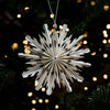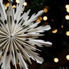 This beautiful snowflake paper decoration, is laser cut, and made from white paper, before being assembled by hand, featuring a delicate white string hanger with beaded detail. It measures approximately 10cm in diameter.